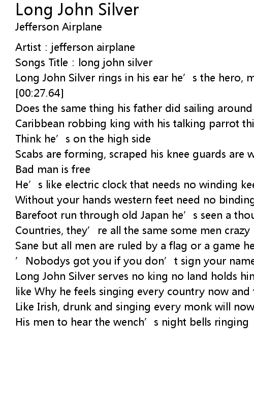 | [00:14.53] | Long John Silver rings in his ear he' s the hero, make that clear |