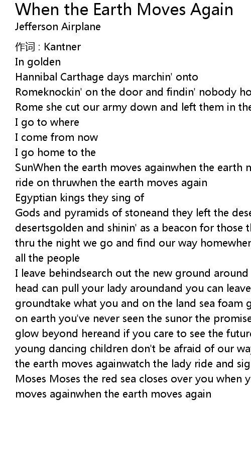 | SunWhen the earth moves againwhen the earth moves again my friendlet the lady ride on thruwhen the earth moves again | |