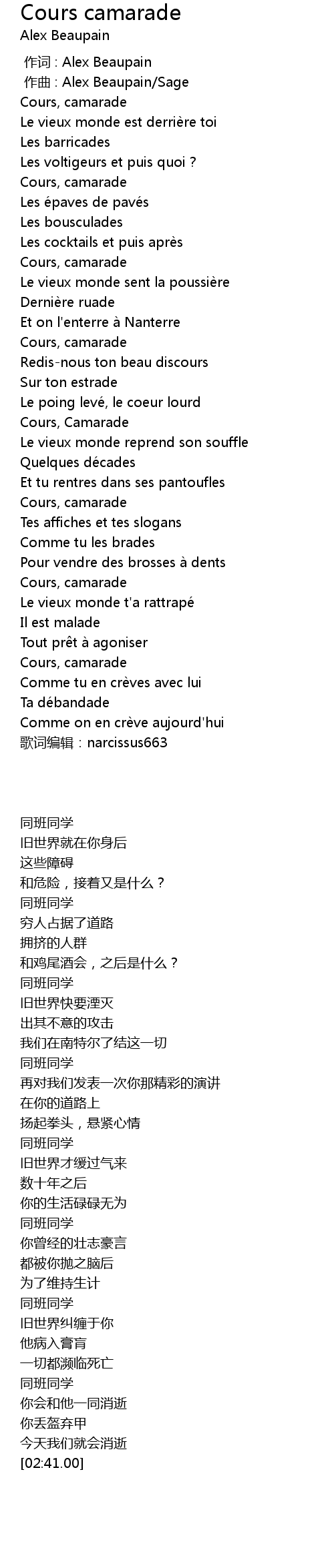 | [00:00.000] | zuò cí : Alex Beaupain |
