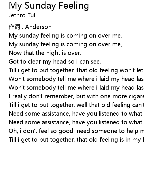 | My sunday feeling is coming on over me, | |