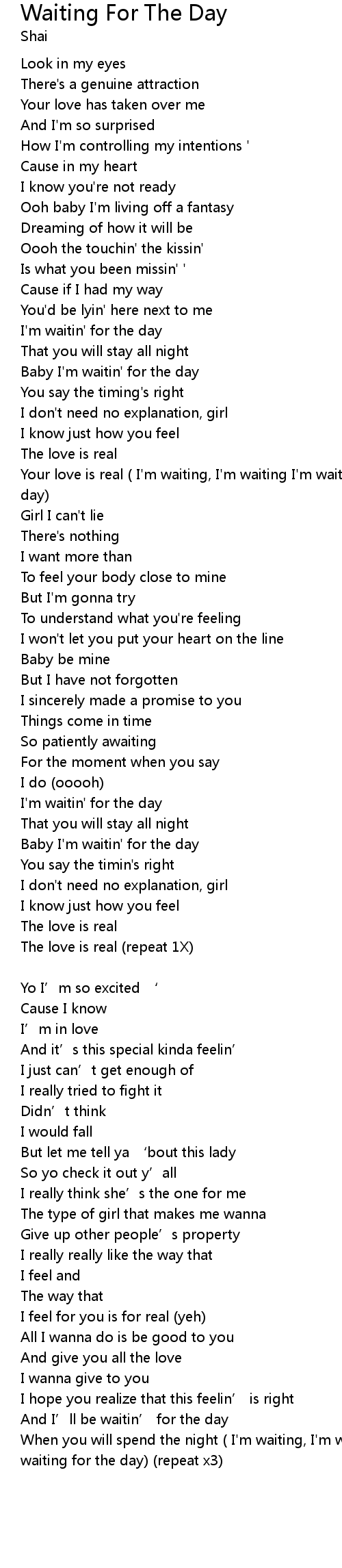 | Your love is real I' m waiting, I' m waiting I' m waiting, I' m waiting for the day | |