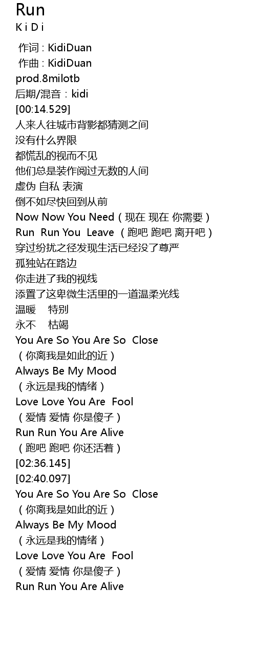 [01:11.427] Run  Run You  Leave (跑吧 跑吧 离开吧)