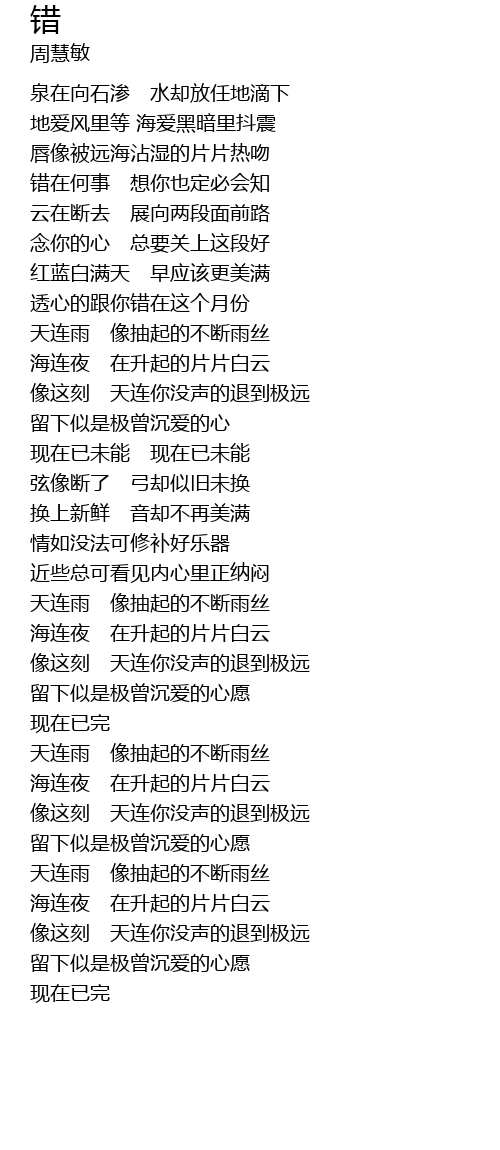 | [00:32.43] | cuo zai he shi xiang ni ye ding bi hui zhi |