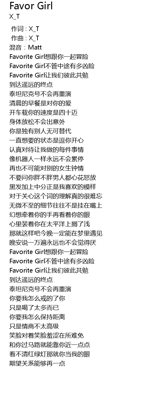 | [00:20.87] | Favorite Girl想跟你一起冒险 |
