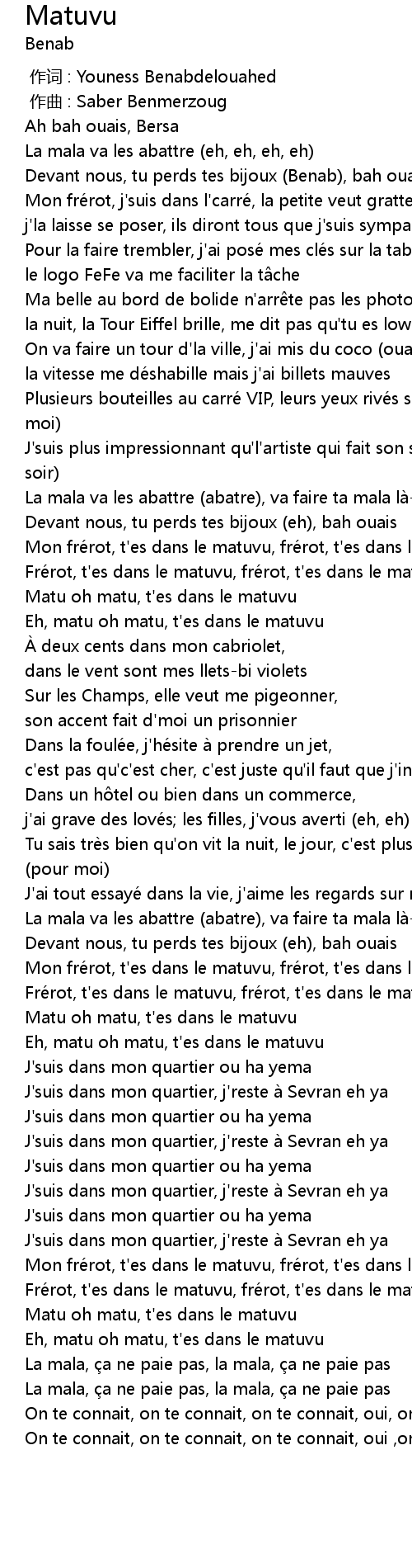 | [02:33.52] | Mon frérot, t'es dans le matuvu, frérot, t'es dans le matuvu |