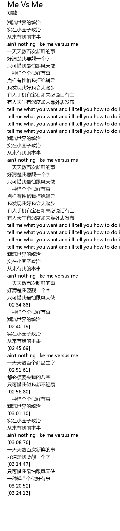 | [02:24.67] | ain' t nothing like me versus me |