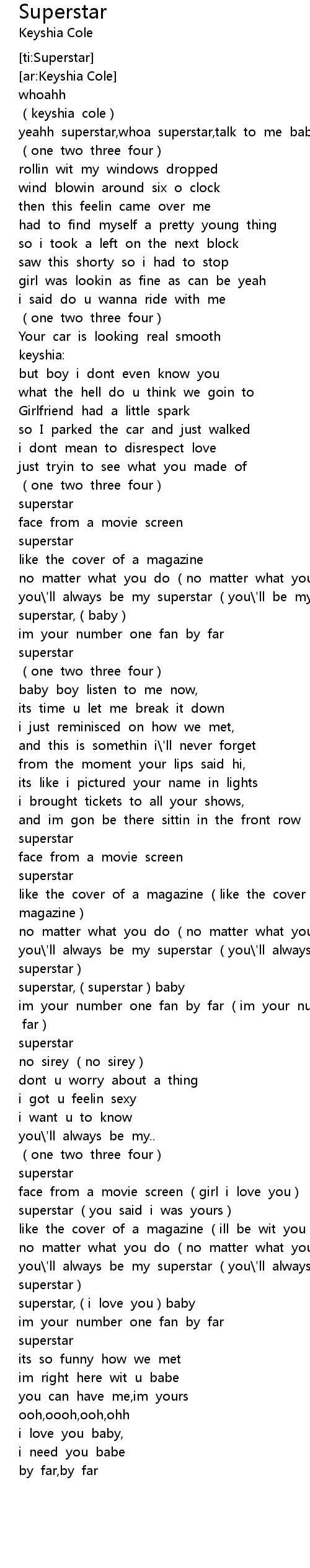 | [00:06.362] | yeahh superstar, whoa superstar, talk to me baby |