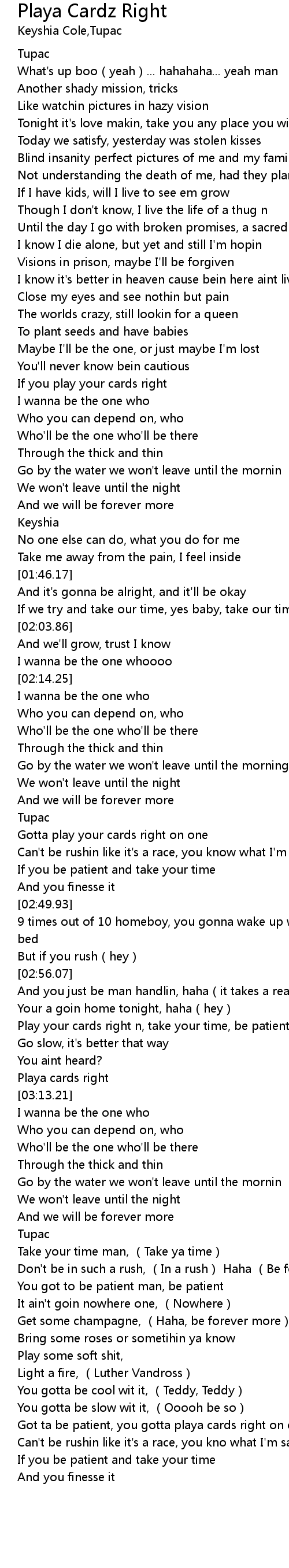 | [04:16.31] | Got ta be patient, you gotta playa cards right on one |
