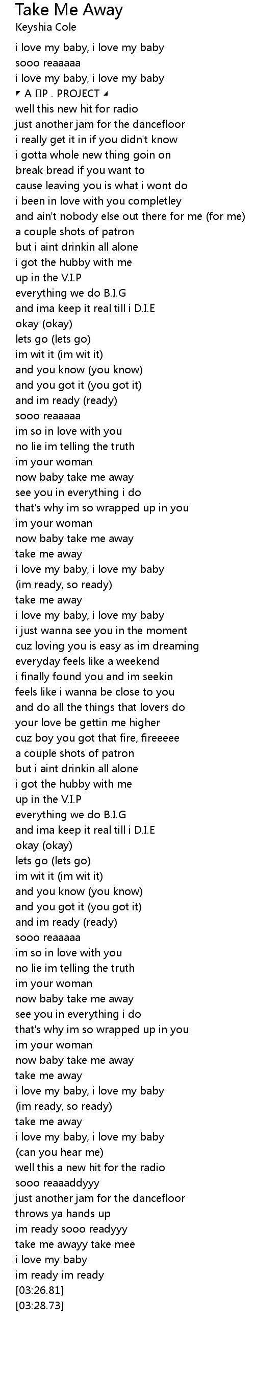 | [01:13.96] | now baby take me away |