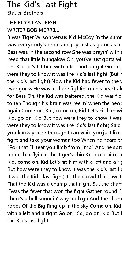 It was Tiger Wilson versus Kid McCoy In the summer of 'ninety-three Now the Kid was everybody's pride and joy Just as game as a kid could be And his darlin' Bess was in the second row She was prayin' with all her might Sayin, "Kid, we need that little bungalow Oh, you've just gotta win tonight" Come on, Kid, come on, Kid Let's hit him with a left and a right Go on, Kid, go on, Kid But how were they to know it was the Kid's last fight (But how were they to know it was the Kid's last fight) Now the Kid had fever to the very bone But nobody would ever guess He was in there fightin' on his heart alone Cause he just had to win for Bess Oh, the Kid was battered, the Kid was floored But the count never got to ten Though his brain was reelin' when the people roared He was up on his feet again Come on, Kid, come on, Kid Let's hit him with a left and a right Go on, Kid, go on, Kid But how were they to know it was the Kid's last fight (But how were they to know it was the Kid's last fight) Said the Tiger, scowlin', don't you know you're through I can whip you just like a child I'm gonna take the fight and take your woman too When he heard that the Kid went wild Said the Kid, "For that I'll tear you limb from limb" And he sprang like an angry colt He said a punch a-flyin at the Tiger's chin Knocked him out like a thunderbolt Come on, Kid, come on, Kid Let's hit him with a left and a right Go on, Kid, go on, Kid But how were they to know it was the Kid's last fight (But how were they to know it was the Kid's last fight) To the crowd that saw it there was little doubt That the Kid was a champ that night But the champ would never have another bout 'Twas the fever that won the fight Gather round, I'm bettin' even money folks There's a bell soundin' way up high And the champ is climbin' through the golden ropes Of the Big Ring up in the sky Come on, Kid, come on, Kid Let's hit him with a left and a right Go on, Kid, go on, Kid But how were they to know it was the Kid's last fight |