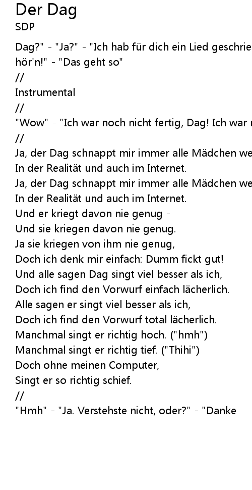 | Dag?" " Ja?" " Ich hab fü r dich ein Lied geschrieben" " Okay, lass mal h r' n!" " Das geht so" | |