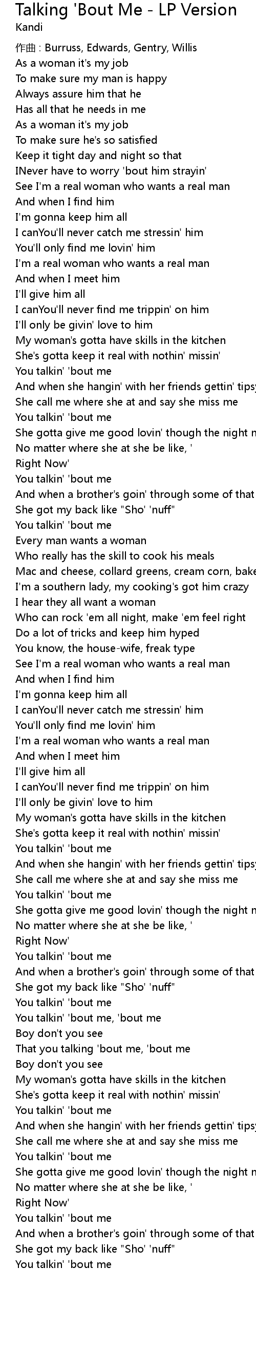 | Song | Talking 'Bout Me - LP Version |
