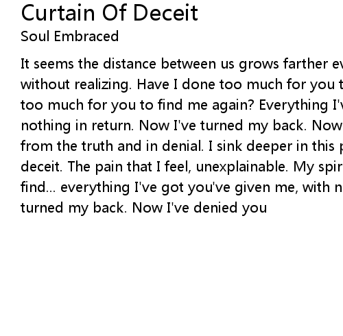 It seems the distance between us grows farther everyday. By my own actions, without realizing. Have I done too much for you to find me again? Have I done too much for you to find me again? Everything I've got you've given me, with nothing in return. Now I've turned my back. Now I've denied you. Locked away from the truth and in denial. I sink deeper in this pit behind a curtain of deceit. The pain that I feel, unexplainable. My spirit wounded. All alone I find... everything I've got you've given me, with nothing in return. Now I've turned my back. Now I've denied you |