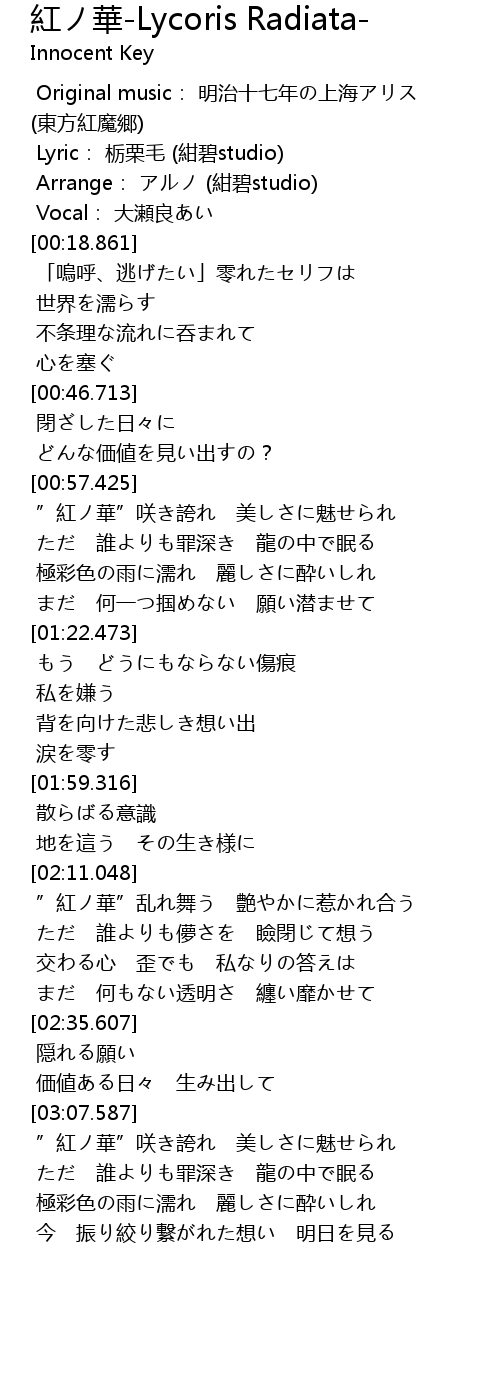 | [02:22.813] | 交わる心 歪でも 私なりの答えは |