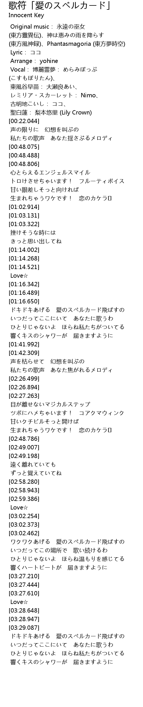| [03:29.216] | ドキドキあげる 愛のスペルカード飛ばすの |