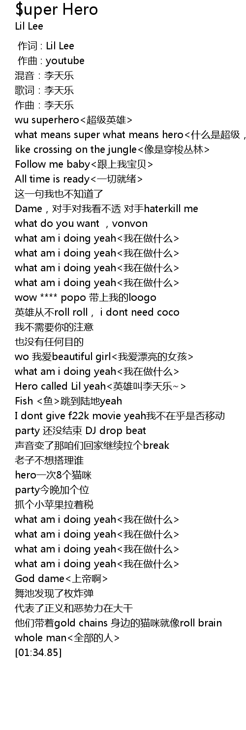 | [01:03.66] | Hero called Lil yeah<英雄叫李天乐~> |
