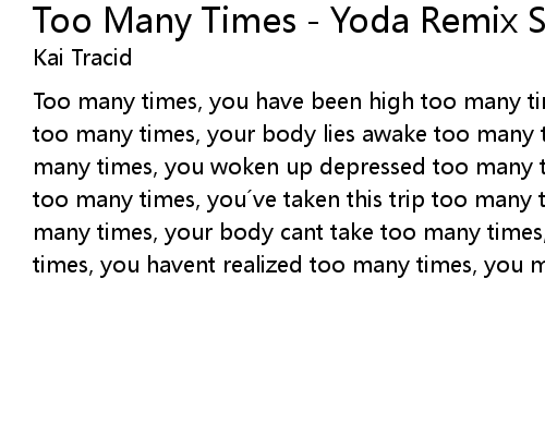 | Too many times, you have been high too many times, you ran away, in need to cry too many times, your body lies awake too many times, these pills you take... too many times, you woken up depressed too many times, you put your life to the test too many times, you ve taken this trip too many times, you have slipped too many times, your body cant take too many times, you made a mistake too many times, you havent realized too many times, you mind became paralyzed |