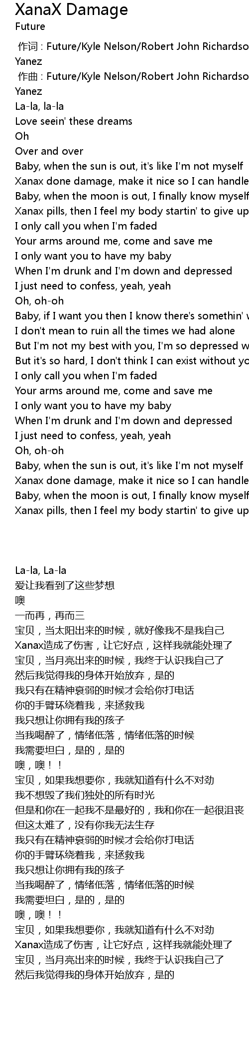 | [00:17.10] | Xanax done damage, make it nice so I can handle it |