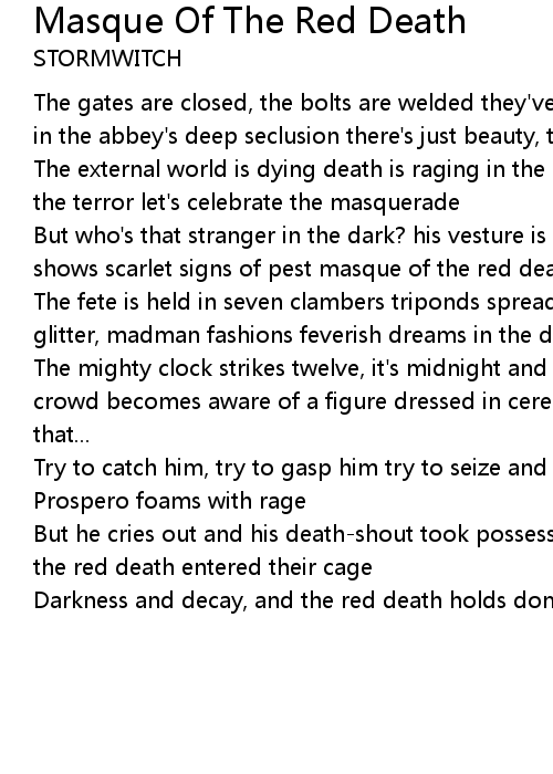 But who's that stranger in the dark? his vesture is dabbled in blood his masque shows scarlet signs of pest masque of the red death |