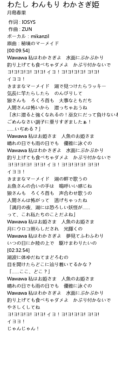 | [03:11.62] | Wawawa 私はわかさぎよ 水面にぷかぷかり |