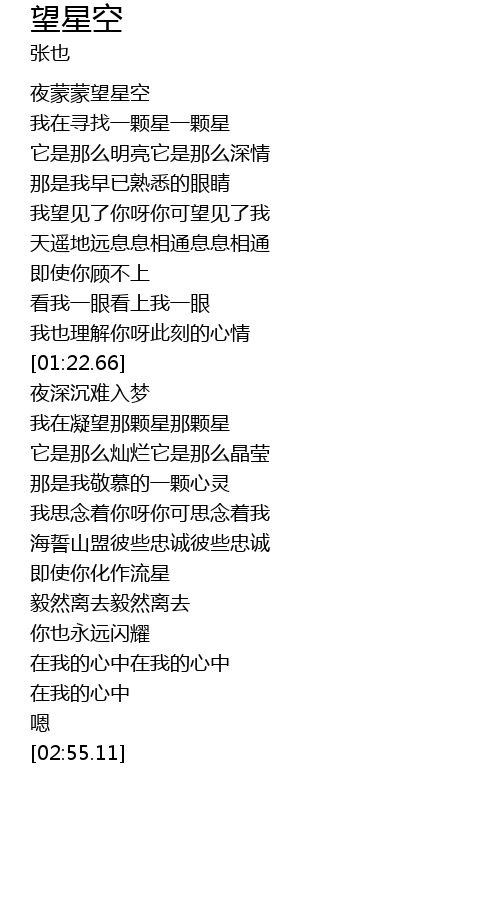 | [01:45.22] | wǒ zài níng wàng nà kē xīng nà kē xīng |