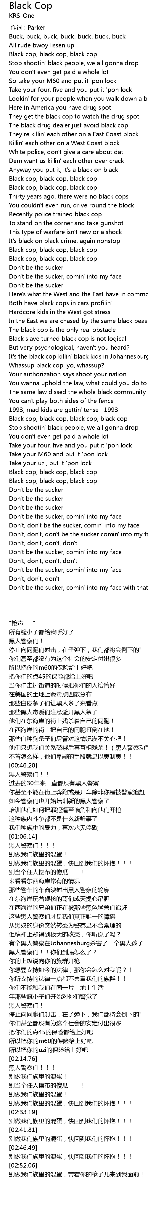 | [01:58.16] | Black cop, black cop, black cop, black cop |