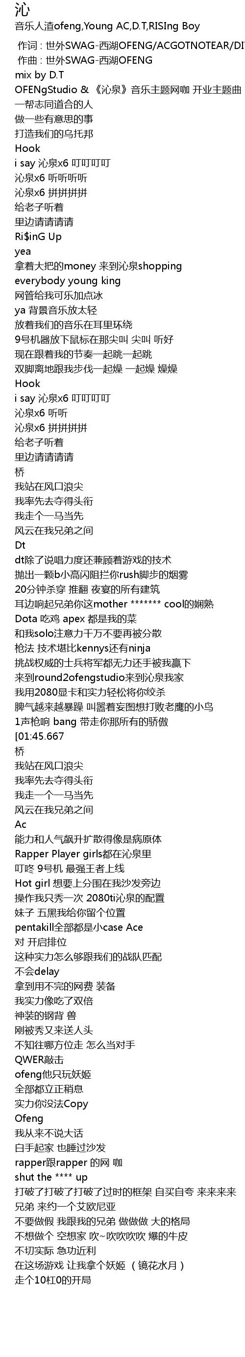 | [00:00.000] | 作词 : 世外SWAG-西湖OFENG/ACGOTNOTEAR/DITRASH/RISIng Boy |