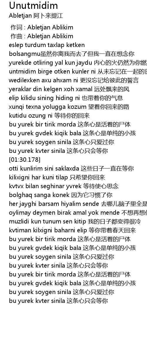| [00:29.686] | eslep turdum taxlap ketken bolsangmu sui ran ni li wo er qu le dan wo yi zhi zai xiang nian ni |