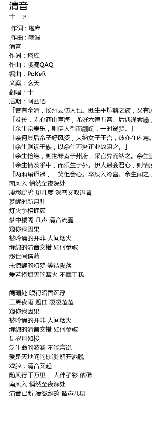 | [00:13.03] | 「昔有余清,扬州云伤人也。既生乎煊赫之族,又有风神俊逸之姿,清流雅量,不类乎世雰。」 |