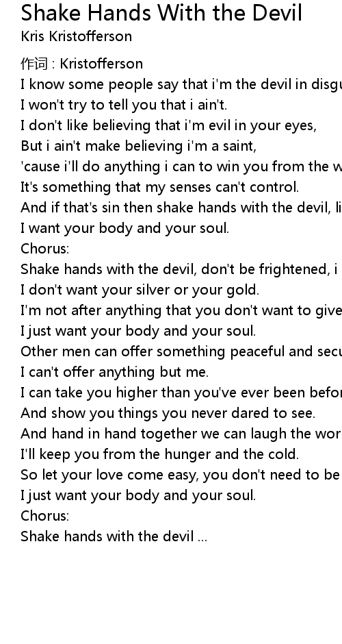 | Shake hands with the devil, don' t be frightened, i won' t hurt you. | |