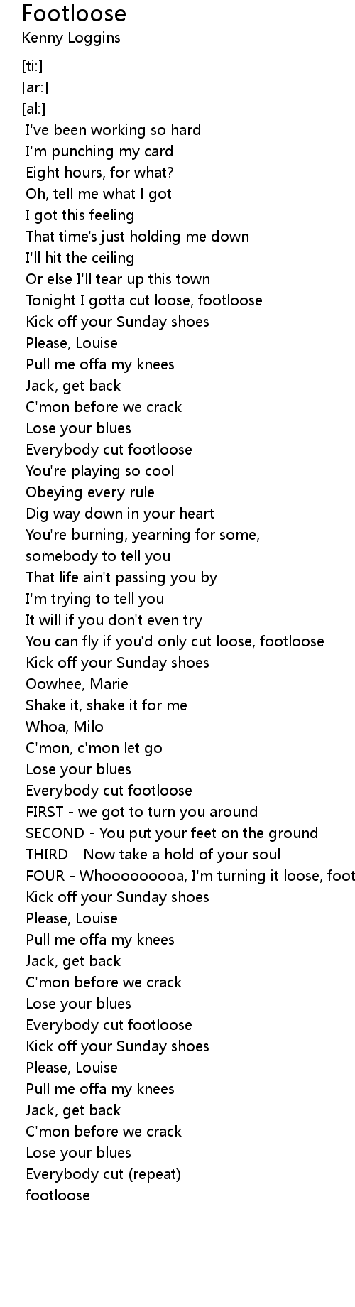 FOUR - Whooooooooa, I'm turning it loose, footloose |