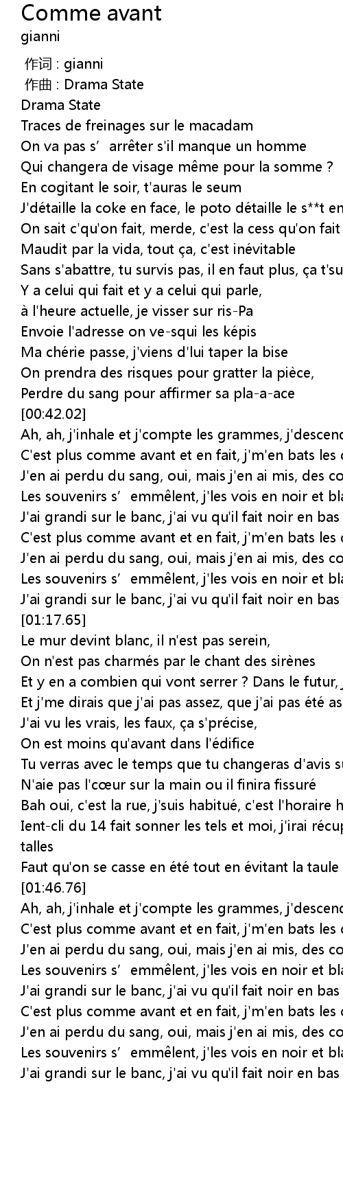 | [00:54.45] | C'est plus comme avant et en fait, j'm'en bats les couilles |