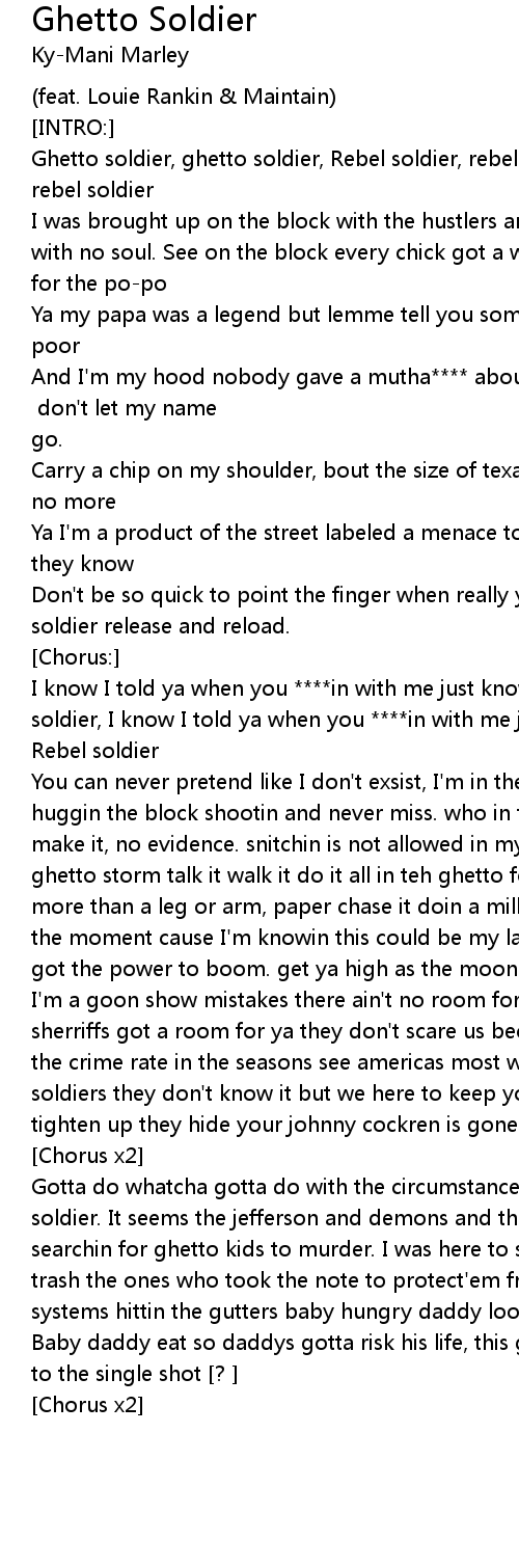 You can never pretend like I don't exsist, I'm in the mist of the thugs, and I'm huggin the block shootin and never miss. who in the hell is this, witness never make it, no evidence. snitchin is not allowed in my residence, born in this ghetto storm talk it walk it do it all in teh ghetto form soldiers born and lose more than a leg or arm, paper chase it doin a million miles an hour, live for the moment cause I'm knowin this could be my last hour.got the flower to bloom, got the power to boom. get ya high as the moon but with these cowards I'm doomed I'm a goon show mistakes there ain't no room for ya ain't no errors cause the sherriffs got a room for ya they don't scare us because the terrors increases the crime rate in the seasons see americas most wanted on your tv's ghetto soldiers they don't know it but we here to keep your poppin this song keep tighten up they hide your johnny cockren is gone |