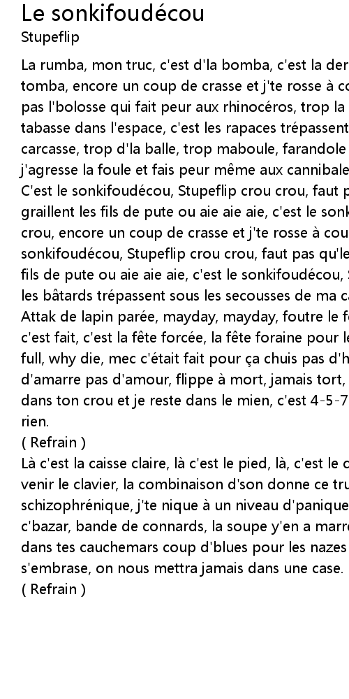 | C' est le sonkifoudé cou, Stupeflip crou crou, faut pas qu' les narvals se graillent les fils de pute ou aie aie aie, c' est le sonkifoudé cou, Stupeflip crou, encore un coup de crasse et j' te rosse à coup d' crosse, c' est le sonkifoudé cou, Stupeflip crou crou, faut pas qu' les narvals se graillent les fils de pute ou aie aie aie, c' est le sonkifoudé cou, Stupeflip crou crou, tous les b tards tré passent sous les secousses de ma carcasse. | |