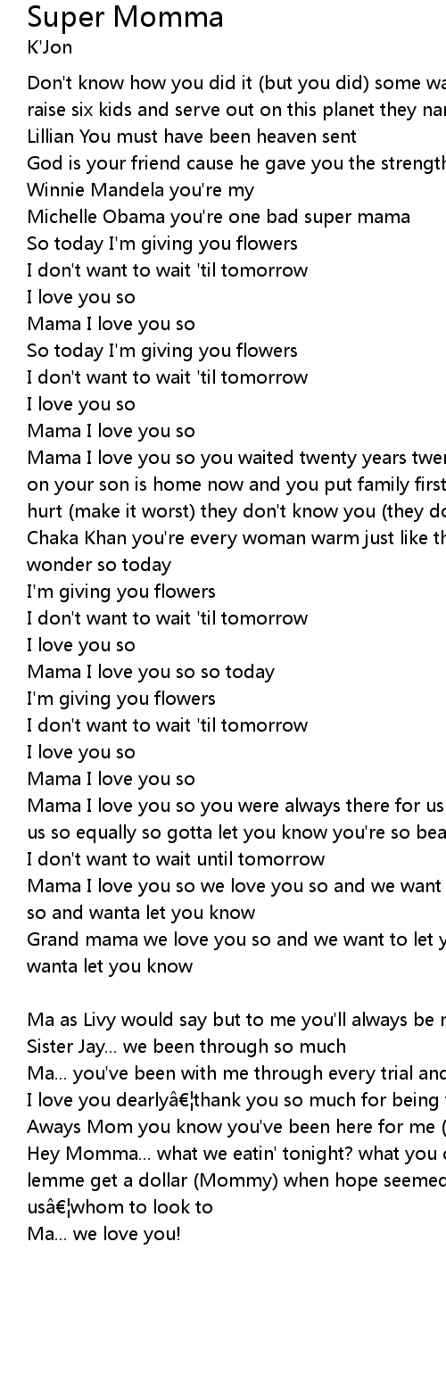 | Mama I love you so you were always there for us faithfully you love every one of us so equally so gotta let you know you' re so beautiful | |