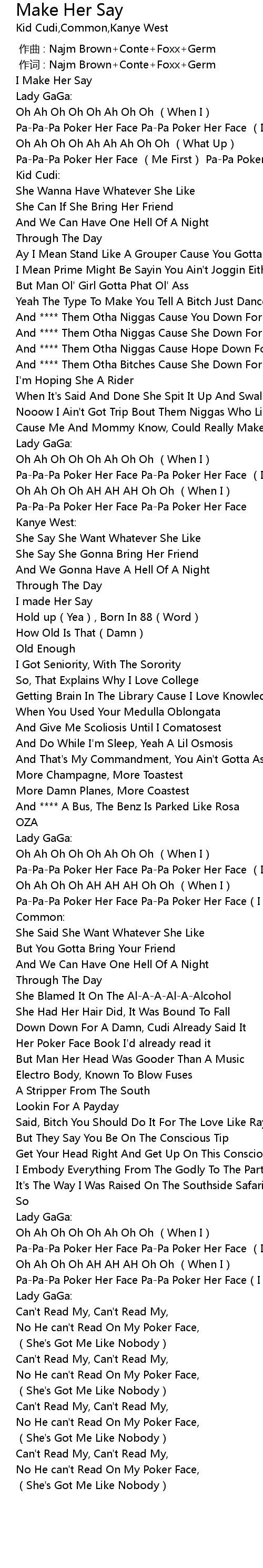 | [03:00.07] | PaPaPa Poker Her Face PaPa Poker Her Face I Make Her Say |