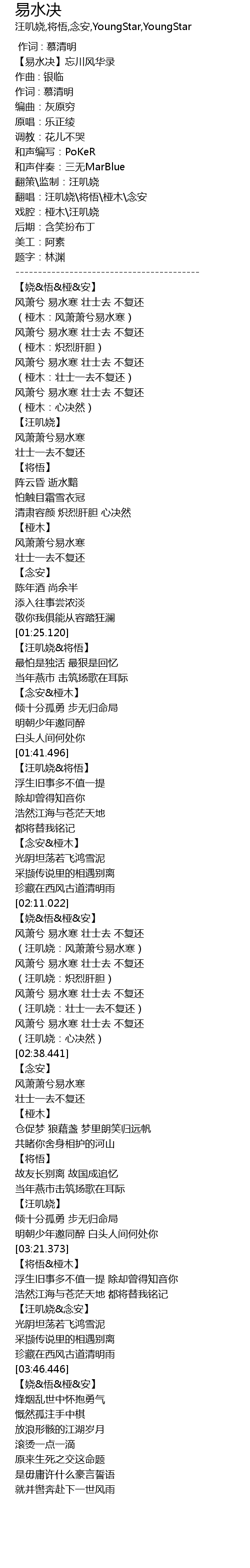 | [00:11.652] | yā mù: fēng xiāo xiāo xī yì shuǐ hán |