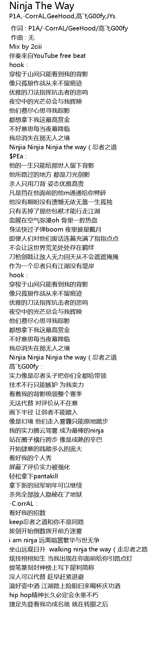 | [01:49.932] | Ninjia Ninjia Ninjia the way rěn zhě zhī dào |