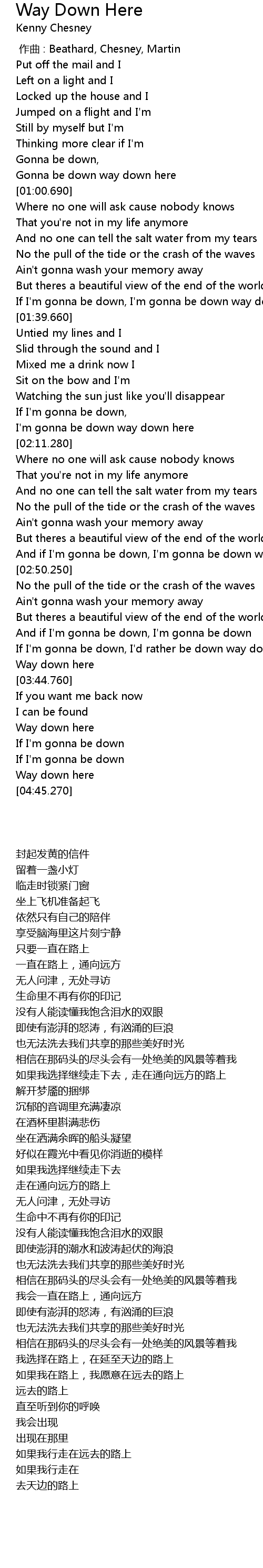 | [01:30.100] | If I'm gonna be down, I'm gonna be down way down here |
