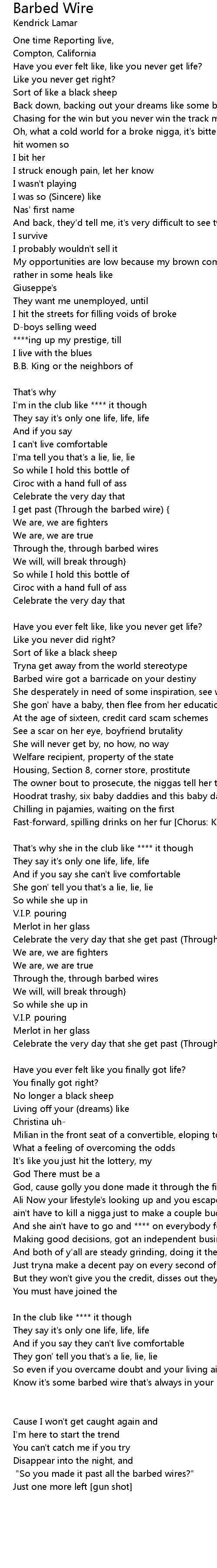 Know it's some barbed wire that's always in your path (Through the barbed wire) [Kendrick Lamar] |