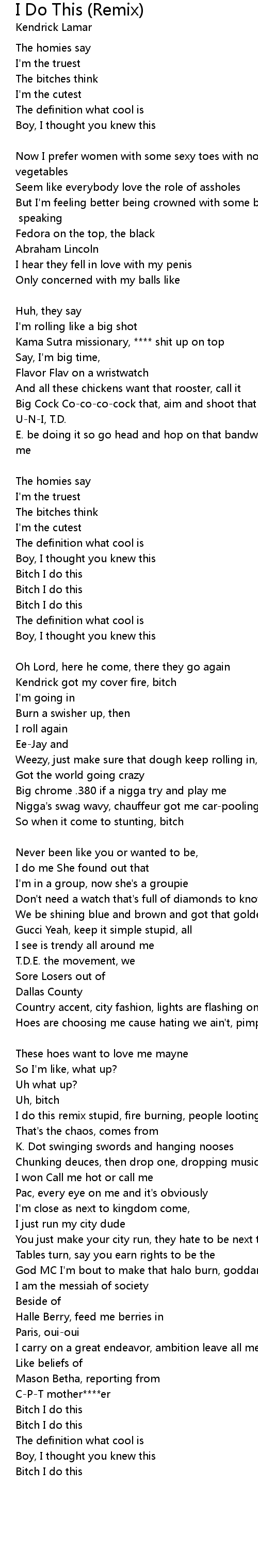 I'm still serving broads on my chest for gratuity [Chorus 2: Kendrick Lamar] |
