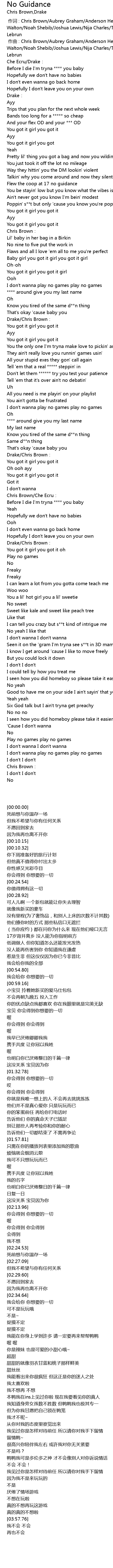 | [00:00.000] | 作词 : Chris Brown/Aubrey Graham/Anderson Hernandez/Teddy Walton/Noah Shebib/Joshua Lewis/Nija Charles/Tyler James Bryant/Michee Patrick Lebrun |