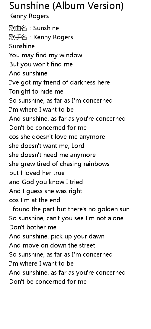 | [00:34.290] | So sunshine, as far as I' m concerned |