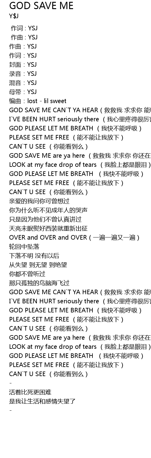 | [00:43.218] | GOD SAVE ME are ya here (救救我 求求你 你还在吗) |