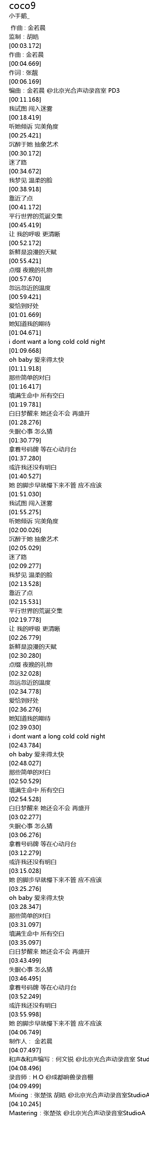 | [04:09.745] | Mixing: zhang chu xian hu hao bei jing guang he sheng dong lu yin shi StudioA |