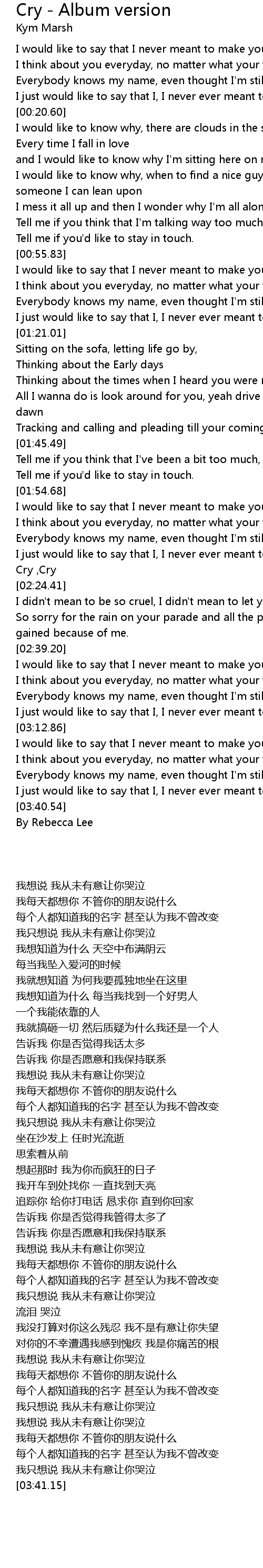 | [03:05.47] | I just would like to say that I, I never ever meant to make you Cry |