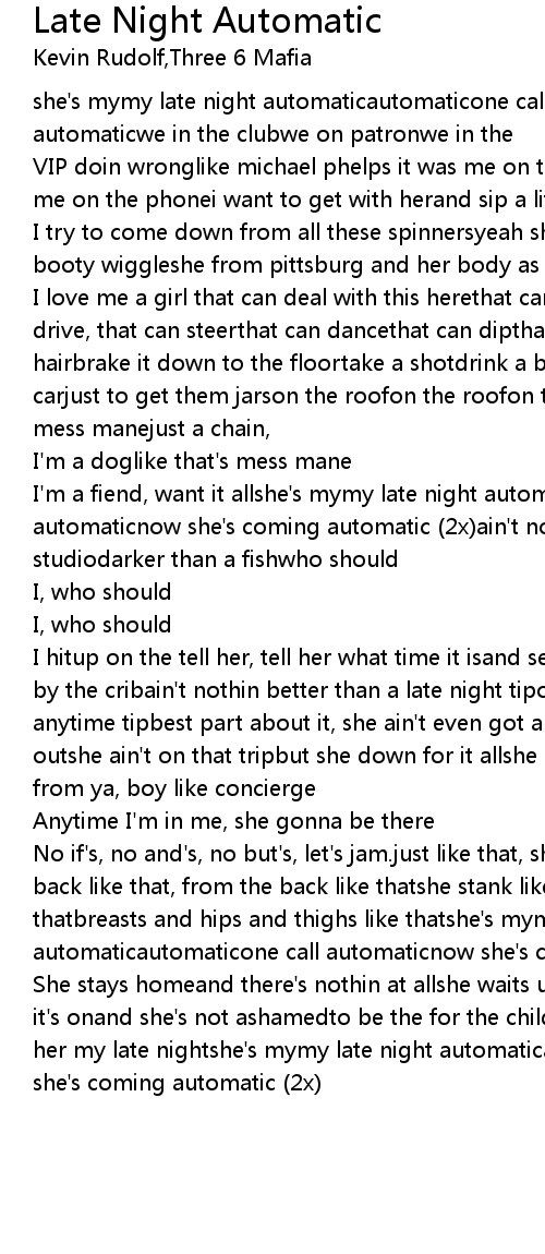 No if's, no and's, no but's, let's jam.just like that, she down like thatgot my back like that, from the back like thatshe stank like that, super fine like thatbreasts and hips and thighs like thatshe's mymy late night automaticautomaticone call automaticnow she's coming automatic (2x) |