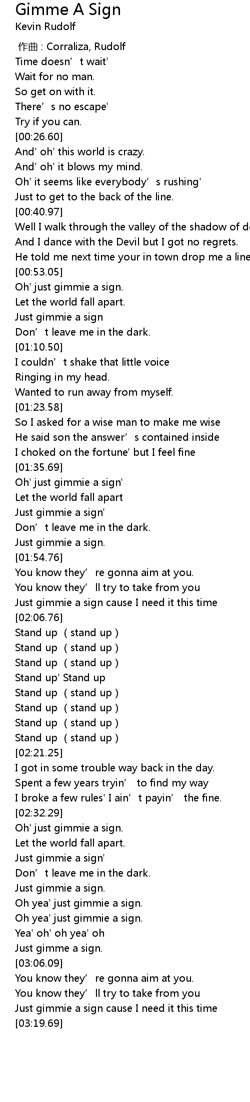 | [02:51.61] | Oh yea' just gimmie a sign. |