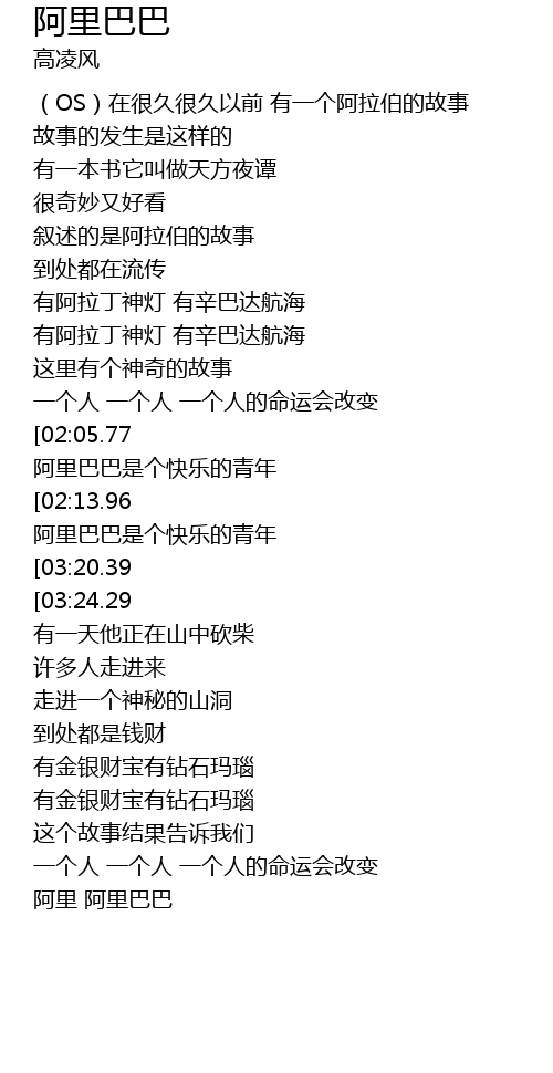 | [03:06.83][02:05.77][00:56.39] | 阿里 阿里巴巴 阿里巴巴是个快乐的青年 |