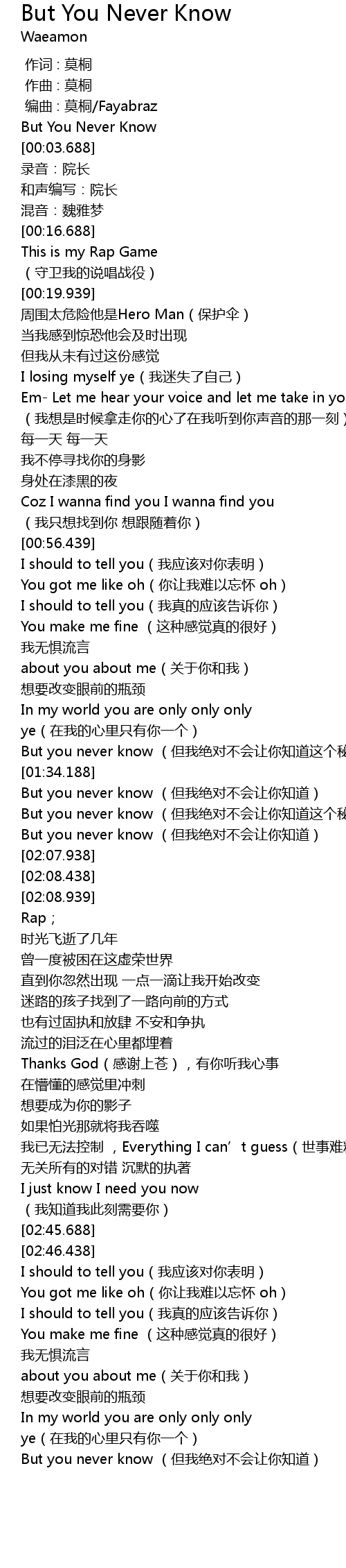| [01:59.188] | But you never know dàn wǒ jué duì bú huì ràng nǐ zhī dào |
